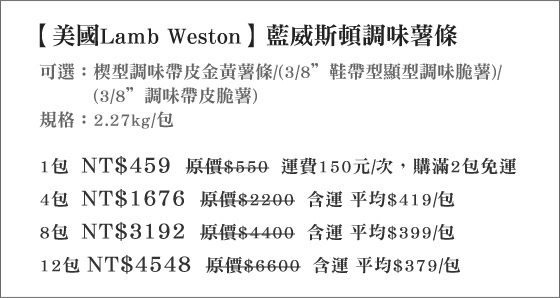 | 美國Lamb Weston-藍威斯頓調味薯條-酥香脆的涮嘴薯條!無論是經典細條或是厚切紮實份量,這邊都能滿足,鹹香開胃不油膩,讓您一口接一口停不下平均每包最低只要379元起(2包免運)即可享有【美國L 售價:379 我要購買 |
